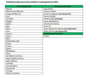 El 71 por ciento de las entidades locales de Asturias (ayuntamientos, mancomunidades y parroquias rurales) ha rendido en plazo sus cuentas de 2023 ante la Sindicatura de Cuentas del Principado de Asturias, cuatro puntos menos que en el ejercicio anterior. Es el peor dato de rendición de los últimos 5 años. El plazo concluyó el 15 de octubre.